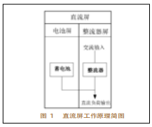 2直流屏作業(yè)原理圖1為直流屏作業(yè)原理簡(jiǎn)圖。在圖1中,蓄電池和整流器組成了變電站的直流屏,當(dāng)有交流輸入電源時(shí),整流器作業(yè),把交流電整流成直流電,與蓄電池一起協(xié)作,供應(yīng)直流負(fù)荷安穩(wěn)的直流電源。