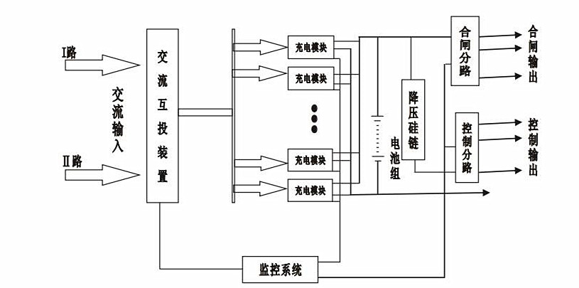 常規(guī)直流屏由交流配電模塊、充電模塊、配電監(jiān)控模塊、降壓硅鏈等零件構(gòu)成。如圖1為典型的直流屏結(jié)構(gòu)系統(tǒng)。