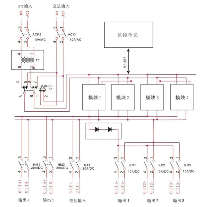 將控制電壓和合閘電壓分配給各負載支路,可實現多種母線的接線方式,并具有配電監控、直流絕緣監測、開關量監測等。