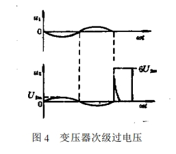 另一方面,直流屏變壓器溝通側也會因為大容量負載如大變比變壓器的合閘瞬間、其它負載堵截電源時以及整流變壓器電刀閘的開關斷開,也會因為初次級繞組間的分布電容,變壓器的鼓勵電流的驟變在次級發生瞬時過電壓,其尖峰值可達作業電壓峰值的6倍以上,如圖4所示。