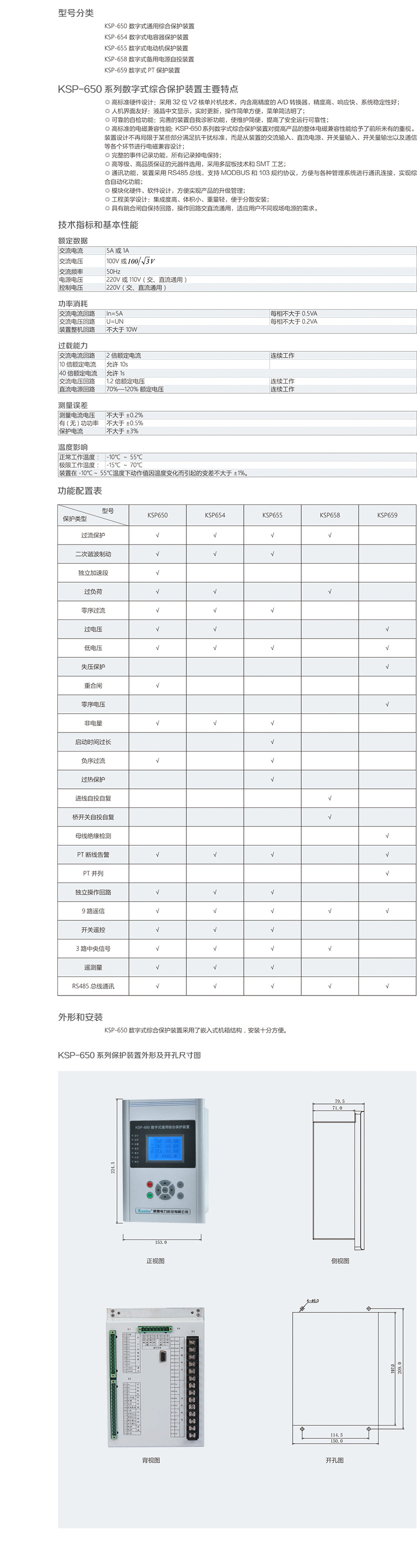KSP-650 系列數字式保護裝置,是我公司最新推出的一款實用型綜 合保護裝置。裝置功能齊全,運行穩定,采用通用型一體化設計理 念,具備保護、測量、控制、通訊完備的功能,廣泛適用于 35kV 及 以下電壓等級變配電站、開閉所等場合。新穎的結構設計,外觀時尚, 結構精巧,既適用于安裝在中置柜內,也可方便安裝于柜體體積狹 小的環網柜等各種柜體。