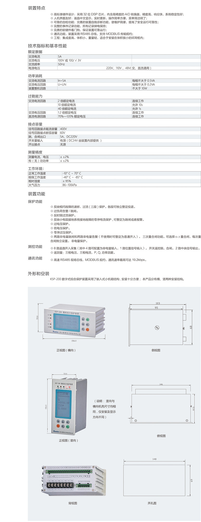 KSP-200 數字式綜合保護裝置是我公司為適應我國電氣成套事業發 展的需要,積累多年電力自動化產品開發經驗,運用新技術、新工 藝而推出的一款經濟性綜合保護裝置。裝置結構設計緊湊、體積小巧, 交直流電源通用,可滿足 10KV 及以下電壓等級進出線、廠用變等保 護測控功能。裝置適宜于安裝在體積狹小的環網柜內,構成智能化 環網柜。